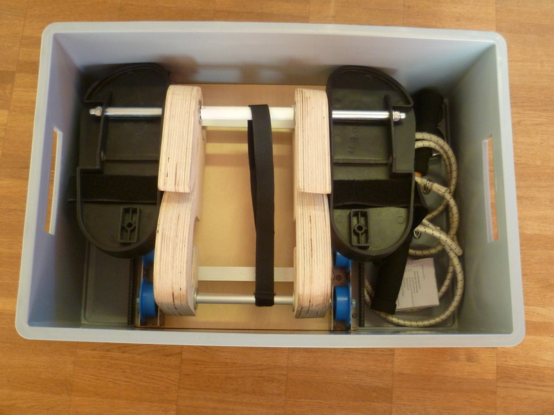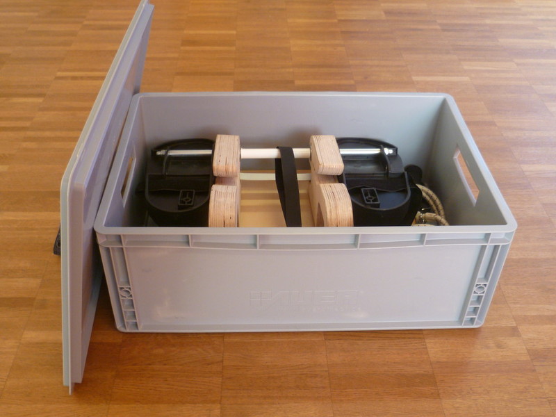 Im abgebauten Zustand passt er in eine 40 x 50 cm große stapelbare Kiste (bei Verwendung von mehreren Sprossenergometern), ist innerhalb 2 Minuten ohne Werkzeug od. anderen Hilfsmitteln aufgebaut und